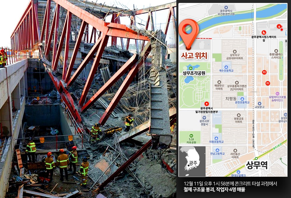 광주 공공도서관 공사 현장에서 철제 구조물이 붕괴하는 사고가 발생했다. 이 사고로 1명이 숨지고 3명이 매몰된 상태다. 이재명 대통령은 총력 대응을 지시했다. 소방 당국에 따르면 11일 오후 1시 58분께 광주 서구 치평동 광주대표도서관 공사장 2층 옥상에서 철제 구조물이 붕괴하면서 4명이 매몰됐다. 현장에선 전체 97명이 작업 중이었다. 이들 모두 하청업체 소속 직원이다. 이날 오후 5시 기준 소방 당국은 매몰자 중 1명을 구조했으나 인근 병원에서 사망 판정을 받았다. 나머지 3명 중 1명의 경우 위치를 파악해 구조 작업을 벌이고 있다. 그러나 2명은 아직 어디에 깔린 건지 위치조차 확인되지 않았다. 특히 소방 당국은 무거운 철골 구조물을 크레인으로 들어 올려야 하는 탓에 구조에 어려움을 겪고 있는 상황이다. 사고는 콘크리트를 타설하고 있던 2층 옥상에서 시작됐다. 건물과 건물 사이를 잇는 형태로 기둥과 기둥 사이 거리는 48m, 폭 20m가량으로 2층 옥상에서 지하층까지 연쇄 붕..