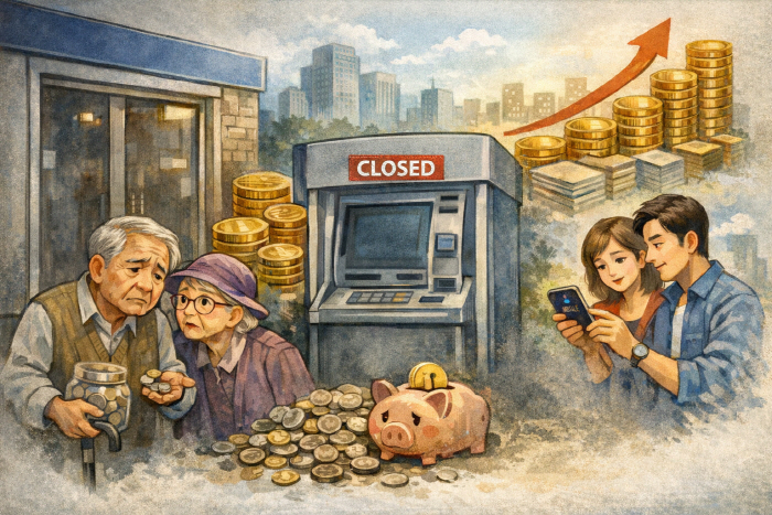 사상 최대 실적을 기록한 은행권에서 오프라인 현금 서비스는 빠르게 축소되고 있다. 영업점과 ATM이 줄고 동전 교환 서비스까지 제한되면서 현금을 사용하는 고령층을 중심으로 불편이 커지고 있다. 특히 현금 수요가 몰리는 명절 기간에 이 같은 불편이 더욱 부각되면서, 금융 취약계층의 금융 접근성이 후퇴하고 있다는 비판이 거세지고 있다. 17일 금융권에 따르면 5대 은행(KB국민·신한·하나·우리·NH농협)의 영업점 수는 지난해 말 기준 3748개로 집계됐다. 이는 전년 말보다 94개 줄어든 수치다. 2020년 말과 비교하면 5년 사이..