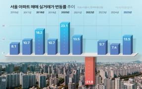 작년 서울 아파트 가격이 전년 대비 13.5% 오른 것으로 집계됐다. 상승률만 놓고 보면 주택가격이 급등했던 2021년 이후 최대치다. 서울시는 23일 한국부동산원의 '공동주택 실거래가격지수' 작년 12월 가격 동향 내용 중 서울시 아파트에 관한 부분을 발췌·정리해 발표했다. 이에 따르면 작년 12월 서울 아파트 매매 실거래가는 전월 대비 0.35% 상승했다. 전년 동월과 비교하면 13.49% 올랐다. 생활권역별로는 도심권이 전월 대비 하락한 것을 제외하면 동남권·서남권·서북권·동북권 4곳에선 올랐다. 특히 동남권의 상승률이 1...