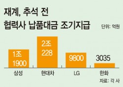 재계가 글로벌 통상 불확실성과 경기 침체 우려가 커진 상황에서도 추석 명절을 앞두고 협력사 납품대금을 조기에 집행하며 상생 경영 의지를 드러내고 있다.22일 재계에 따르면 현대차그룹은 이날 납품 대금 2조228억원을 당초 예정보다 20일 앞당겨 지급하기로 했다.이번 조기 지급은 현대차, 기아, 현대모비스, 현대건설, 현대제철, 현대글로비스, 현대위아, 현대트랜시스 등 주요 그룹사와 부품 및 원자재 등을 거래하는 600..
