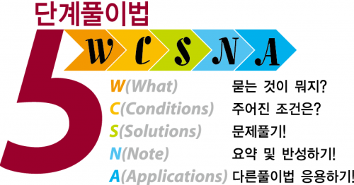 학원에 따르면 WCSNA는 What(문제의 요구 파악)–Conditions(풀이 조건 정리)–Solutions(조건을 활용한 식 세우기 및 풀이)–Note(풀이 과정 요약·점검)–Applications(응용 및 대안 풀이)로 구성된다. 특히 3단계(Solutions)를 핵심으로 두고, 왜 그 접근과 식이 타당한지 근거를 찾게 하는 훈련을 통해 ‘정답 맞히기’에 머무르지 않는 사고 체계를 갖추도록 돕는다는 설명이다.