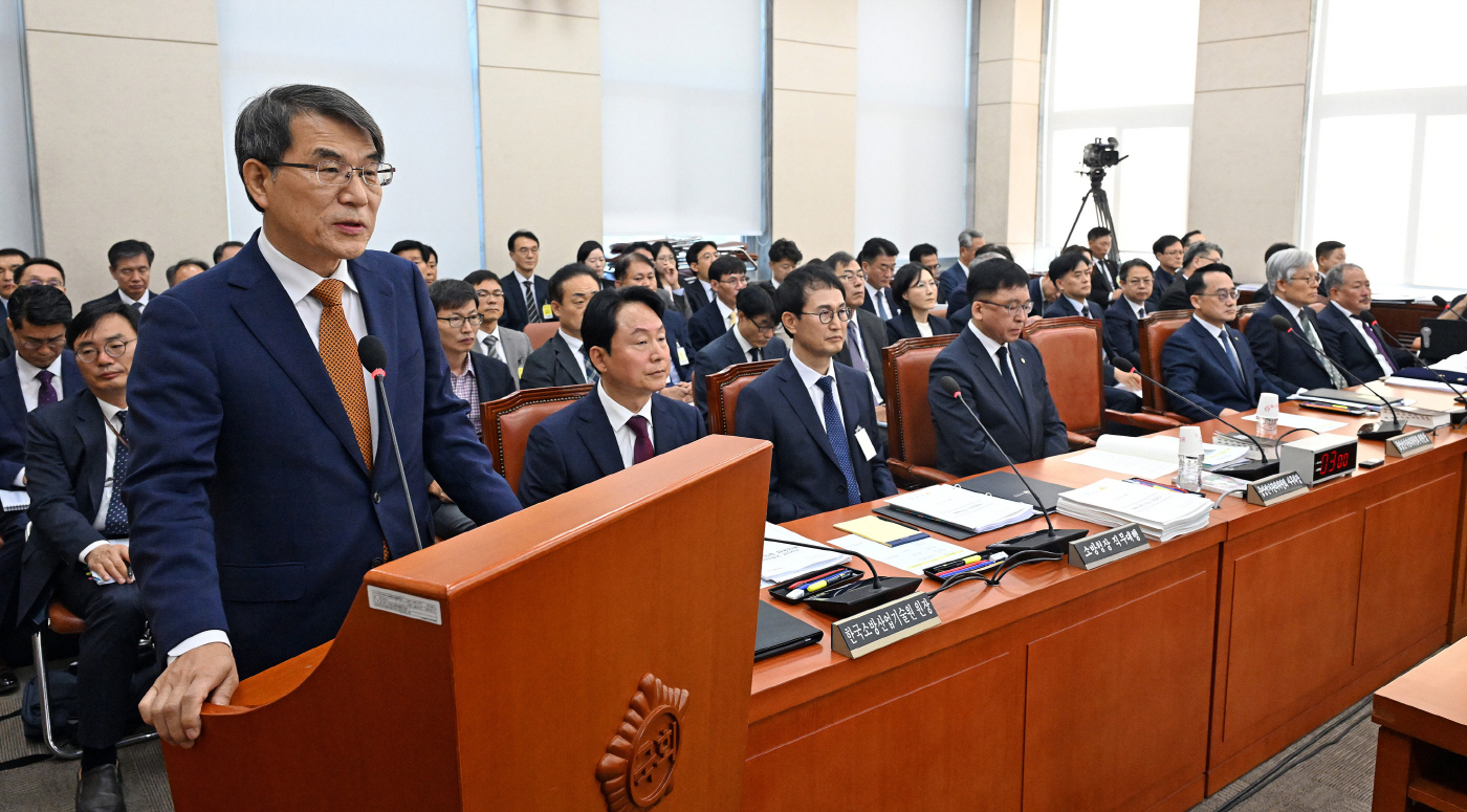 노태악 중앙선거관리위원장이 15일 국회 행정안전위원회에서 열린 중앙선거관리위원회·인사혁신처 등에 대한 국정감사에서 인사말을 하고 있다. /송의주 기자