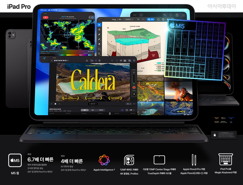 애플은 15일(현지시간) 자체 개발한 차세대 칩 M5를 탑재한 신형 맥북 프로, 아이패드 프로, 애플 비전 프로를 발표하고, 이날부터 사전 주문을 시작한다고 밝혔다. 정식 출시는 이달 22일이다. 한국도 처음으로 1차 출시국에 포함돼 22일부터 구매할 수 있다.
