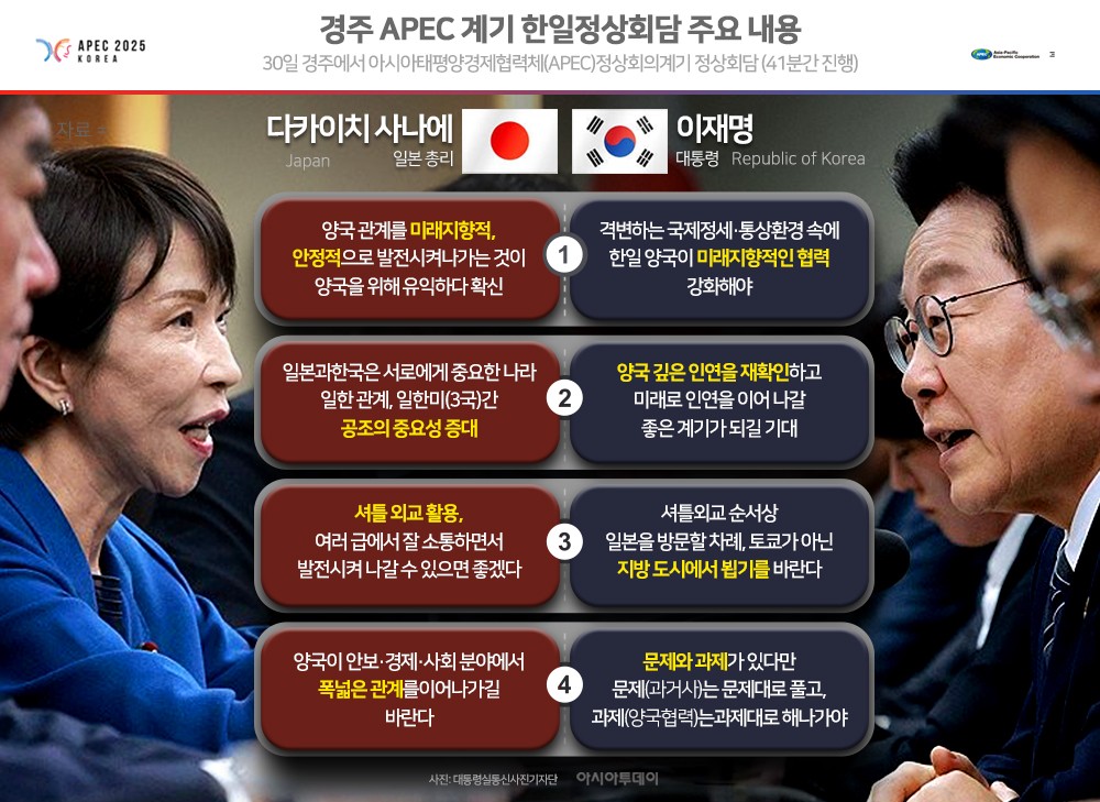 이 대통령은 이날 오후 경주 화백컨벤션센터(HICO)에서 다카이치 총리와 만났다. 지난 21일 취임한 다카이치 총리는 이날 아시아태평양경제협력체(APEC) 정상회의 참석차 2박 3일 일정으로 방한했다.