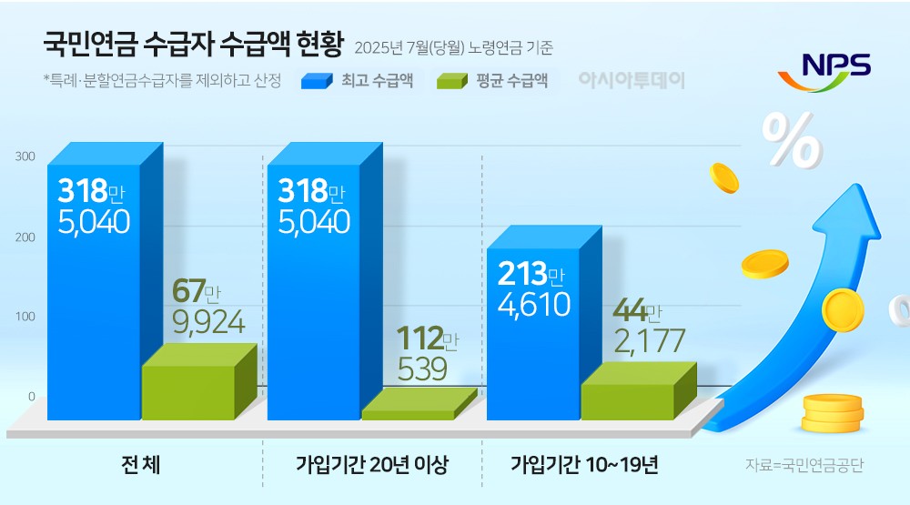 28일 국민연금공단의 '2025년 7월 기준 국민연금 공표통계'에 따르면 현재 국민연금을 가장 많이 받는 수급자의 월 수령액은 318만5040원이었다.
