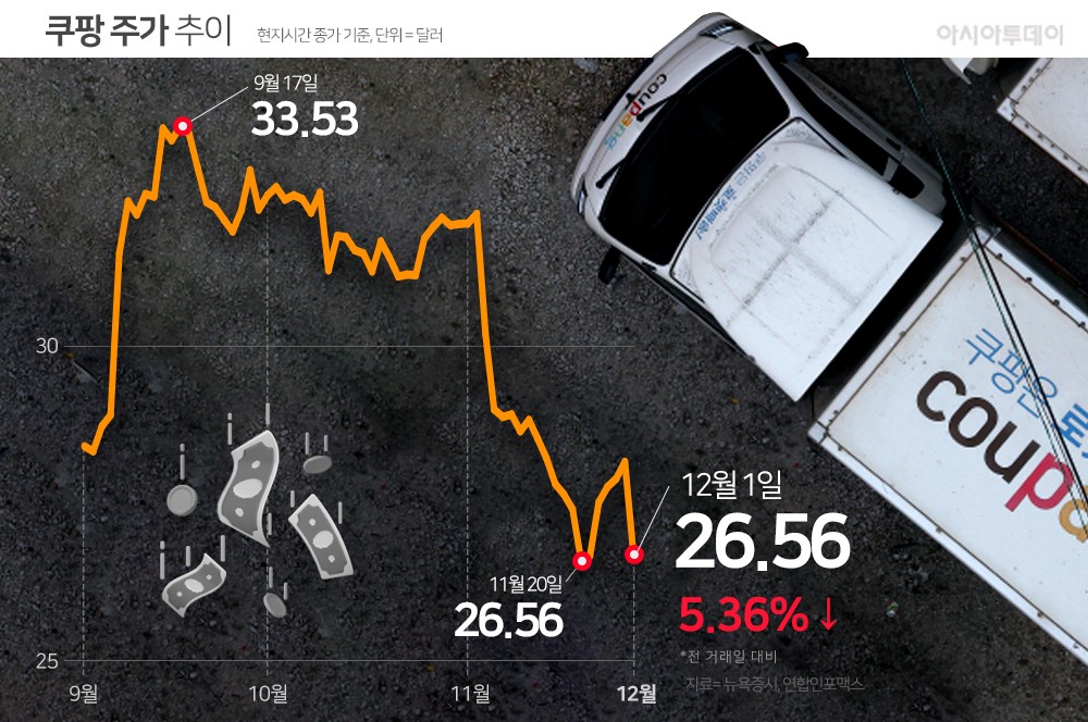 쿠팡Inc는 지난 1일(현지시간) 뉴욕증시에서 전 거래일 대비 5.36% 하락한 26.65달러로 마감했다. 장중 낙폭은 7.21%까지 확대됐고, 프리마켓에서도 9%대 급락이 나타났다. 대규모 개인정보 유출 사실이 공개된 뒤 맞은 첫 거래일에 주가가 급락한 것으로 분석된다.