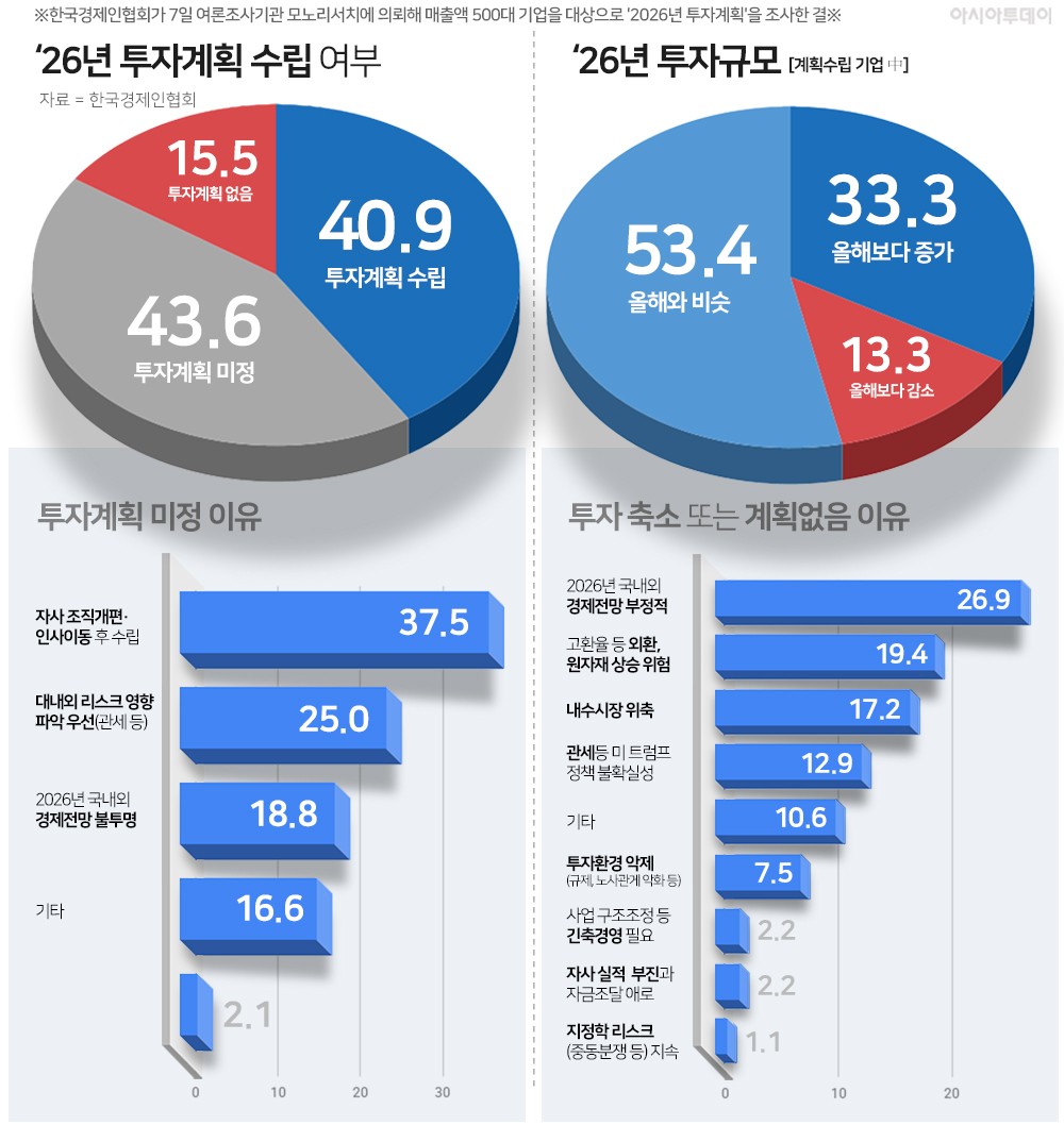 7일 한경협은 여론조사기관 모노리서치에 의뢰해 매출액 500대 기업을 대상으로 '2026년 투자계획'(110개사 응답)을 조사해 이같이 밝혔다. 한경협 조사 결과, 응답 기업의 59.1%는 내년도 투자계획을 아직 수립하지 못했거나(43.6%) 투자계획이 없다(15.5%)고 응답했다. 계획을 수립했다는 응답은 40.9%였다.