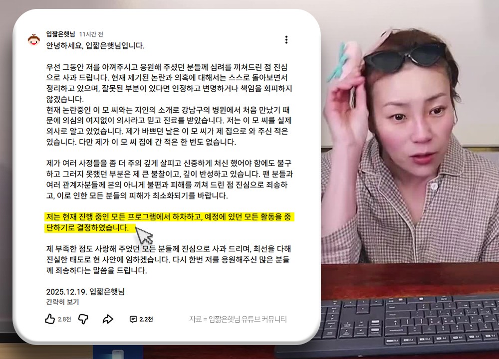 입짧은햇님, ‘주사이모’ 논란 인정…모든 활동 중단 선언 “의사로 믿고 진료받아”