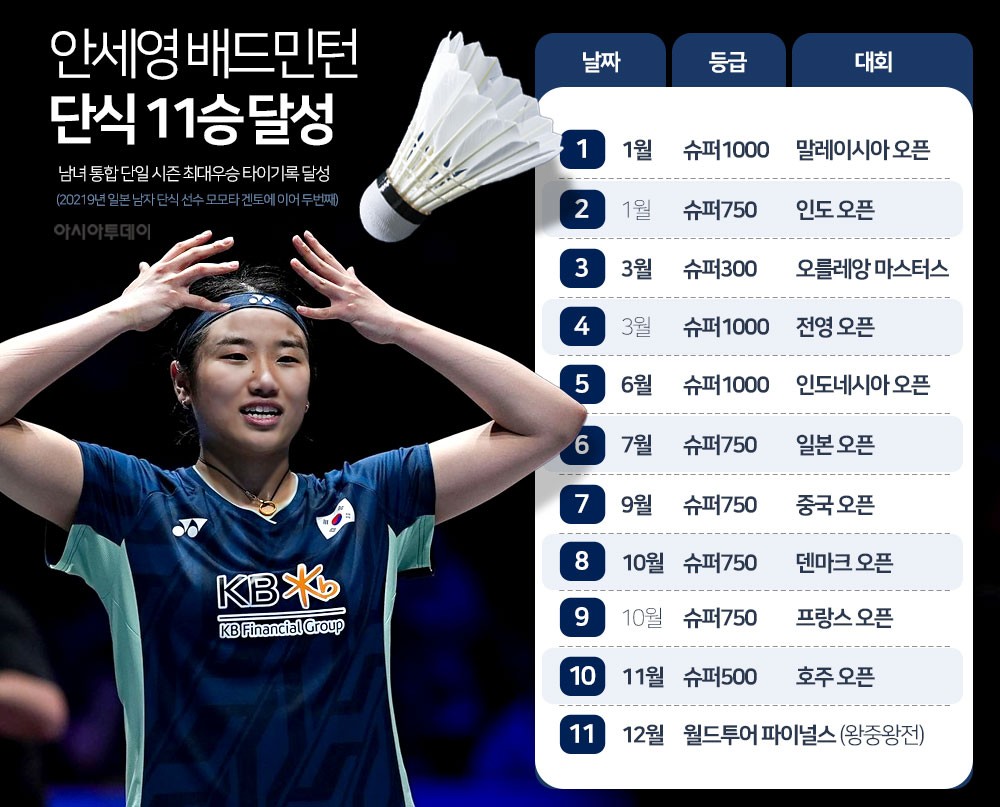 안세영은 21일 중국 항저우 올림픽스포츠센터에서 열린 세계배드민턴연맹(BWF) 월드투어 파이널스 2025 여자 단식 결승에서 중국의 왕즈이를 2-1(21-13, 18-21, 21-10 )로 누르고 우승했다. 이로써 안세영은 올 시즌 11번째 트로피를 차지하며 2019년 일본의 남자 선수 모모타 겐토가 세운 한 시즌 최다 우승 기록과 어깨를 나란히 했다. 여자 선수로서는 이 부문 기록을 경신했다.