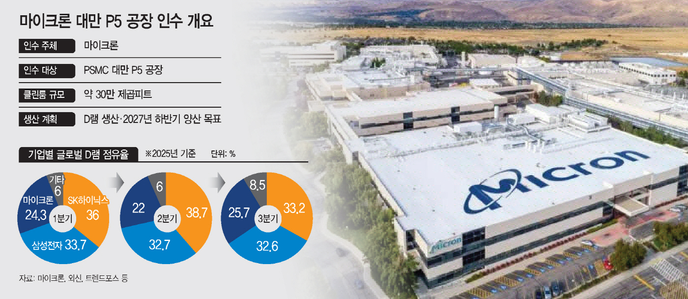 인수 규모 자체가 마이크론의 시장 점유율을 단번에 바꿀만한 수준은 아니라는 평가도 나온다. 업계 관계자는 "통루오 공장은 마이크론이 실적 발표에서 언급했던 캐파 확대 전략의 연장선"이라며 "삼성전자 평택 P5나 용인 반도체 클러스터와 비교하면 규모 자체가 큰 편은 아니다"라고 말했다.