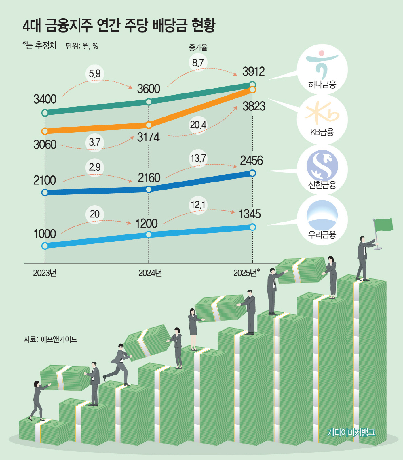 20일 금융정보제공업체 에프앤가이드에 따르면 4대 금융지주의 2025년 회계연도 주당배당금(DPS)은 전년 대비 평균 13.8% 증가할 것으로 전망됐다. 세부적으로는 KB금융이 3174원에서 3823원으로 20.4% 늘어 가장 큰 증가 폭을 보일 것으로 예상됐고, 신한금융은 2160원에서 2456원으로 13.7% 증가할 것으로 예측됐다. 하나금융은 3600원에서 3912원으로, 우리금융은 1200원에서 1345원으로 각각 8.7%, 12.1% 늘어날 것으로 전망됐다.