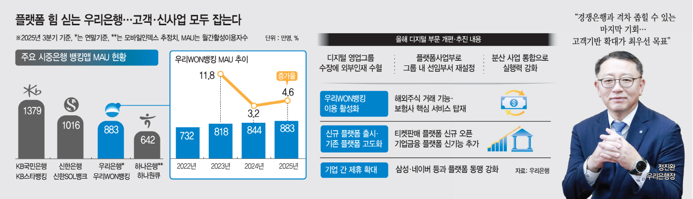 20일 금융권에 따르면 우리은행은 '2026년 디지털 사업계획'에 따라 우리WON뱅킹 이용 활성화를 핵심 목표로 설정했다. 작년 말 기준 우리WON뱅킹의 MAU(월간활성이용자수)는 883만1000명으로 전년 말(843만5000명)보다 4.6% 증가했다. MAU는 한 달간 한 번이라도 해당 플랫폼을 사용한 이용자 수로, 플랫폼 영향력을 평가할 때 활용된다. 지난해 알뜰폰 서비스와 우리투자증권 MTS 도입 등 서비스 확장에 적극 나서면서 전년 대비 증가율이 높아졌다는 설명이다.