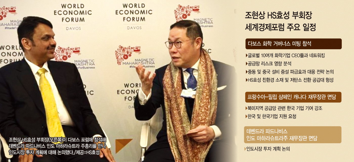 22일 HS효성에 따르면 조 부회장은 지난 19일부터 스위스 다보스에서 개최된 다보스포럼에서 글로벌 화학 산업의 미래를 논의하는 '화학 거버너스(Chemical Governors)미팅'에 공식 초청을 받아 참석했다. 세계 주요 화학기업 경영진이 참여한 자리에서 조 부회장은 산업 구조 변화와 공급망 재편에 대한 의견을 나누는 한편, HS효성의 친환경 소재 및 저탄소 전환 전략에 대해서도 설명했다.
