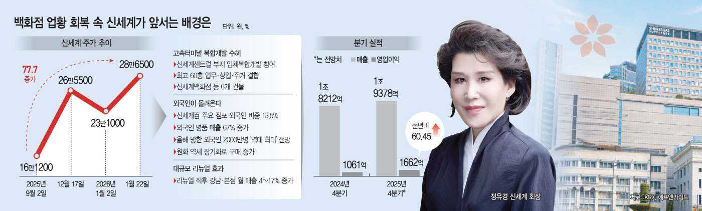 상승을 뒷받침하는 것은 먼저 실적에 대한 기대감 때문이다. 시장조사업체 에프앤가이드에 따르면 신세계의 지난해 4분기 매출은 1조9378억원으로 전년 대비 6.4% 증가가 예상된다. 영업이익은 1662억 원으로 60% 이상 늘어날 전망이다. 매출보다 이익이 더 빠르게 늘어나며, 수익 구조가 바뀌고 있다는 신호다.