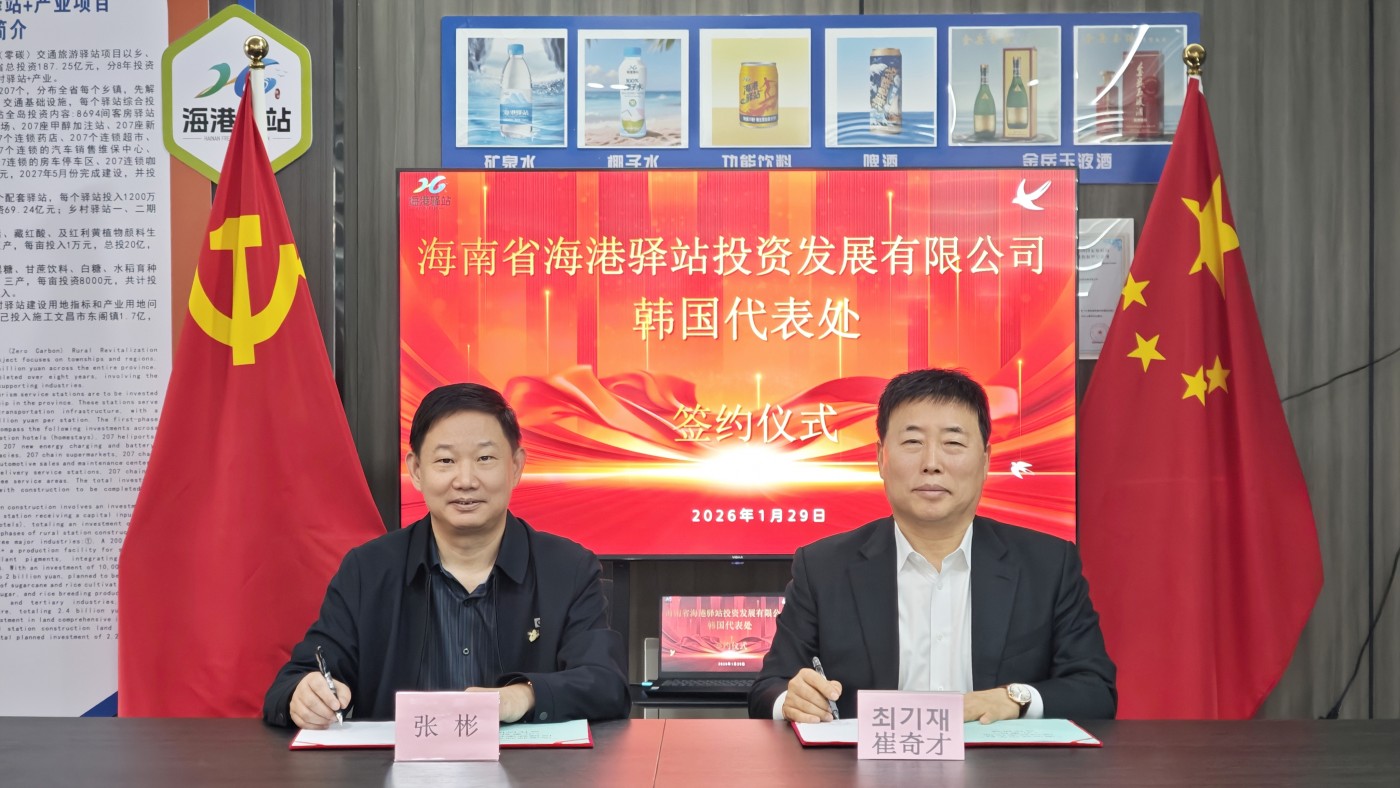 실무 주체인 하이난성 공기업 하이강투자발전유한회사 장표 사장과 한국 일대일로 최기재 수석대표가 계약서에 서명했다.