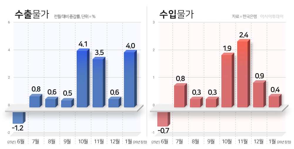 수출은 증가세가 이어졌다. 1월 통관 기준 수출은 전년 동월 대비 33.9% 증가했다. 일평균 수출도 14.0% 늘었다. 반도체(103%)가 두 배 이상 증가했고, 컴퓨터·무선통신기기·자동차 등도 증가세를 보였다. 무역수지는 87억4000만 달러(약 12조6000억원) 흑자로 12개월 연속 흑자를 기록했다. 다만 수출 증가세가 반도체 등 특정 품목에 집중된 점은 변동성 요인으로 지적된다. 글로벌 IT 경기와 미국 통상정책 변화에 따라 수출 흐름이 영향을 받을 가능성도 배제하기 어렵다.