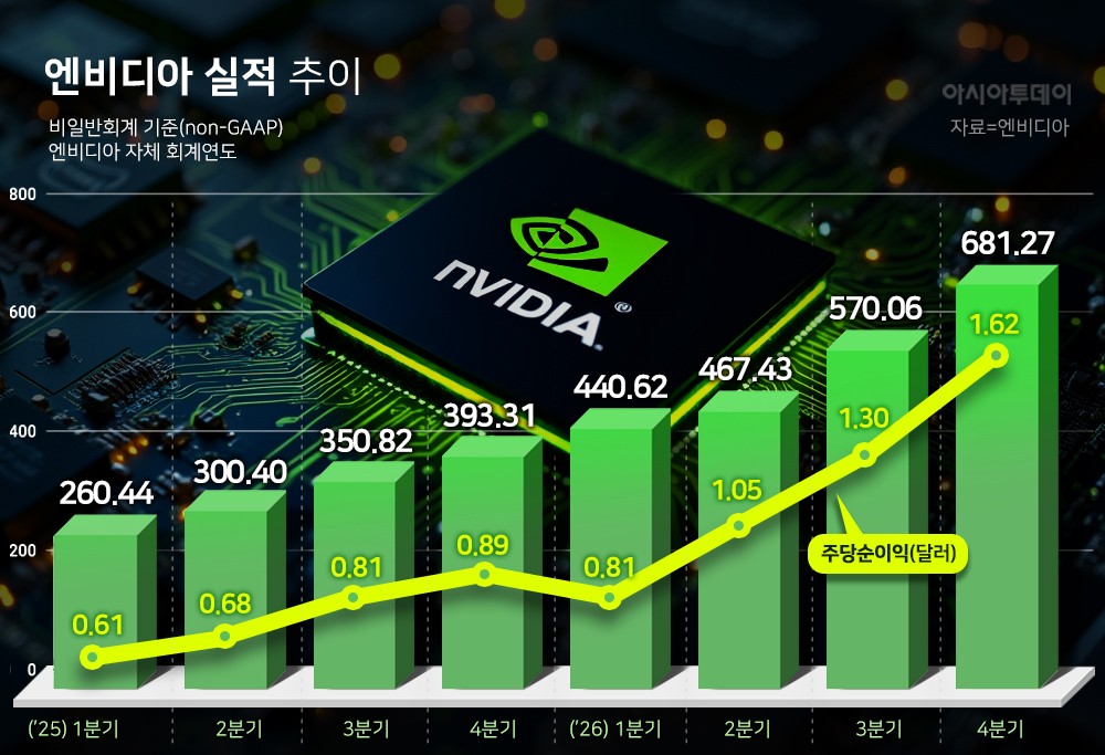 인공지능(AI) 대장주이자 세계 시가총액 1위 기업인 엔비디아가 회계연도 4분기(작년 11월∼올해 1월)에 사상 최대 매출과 순이익을 기록하며 최근 제기된 AI 거품 우려를 잠재웠다고 월스트리트저널(WSJ)이 25일(현지시간) 보도했다.